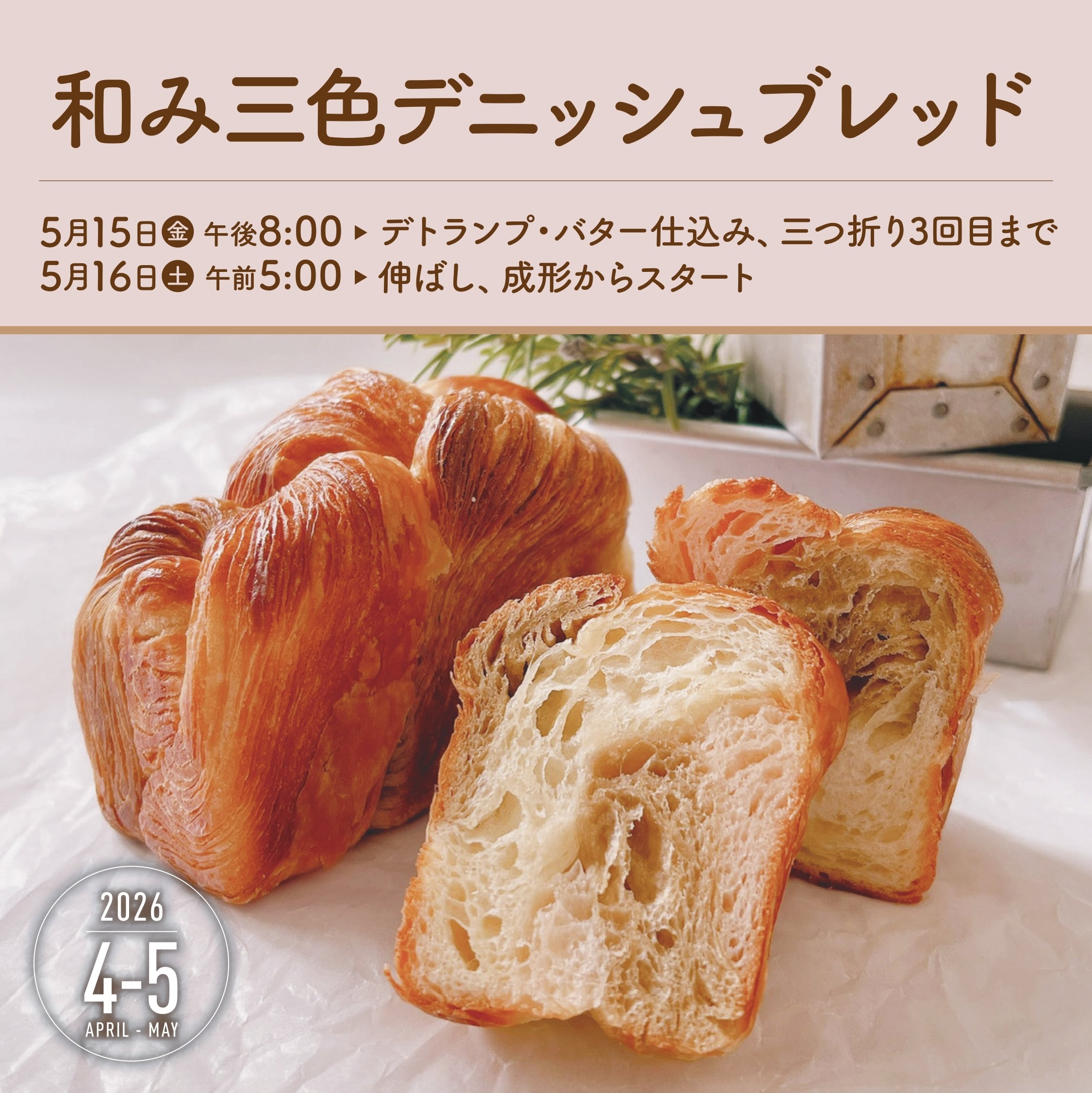 白、桃色、茶色(ほうじ茶)の三つ編みデニッシュ。春色デニッシュ食パンから一歩進めて、色と型のバリエーションを学びましょう。